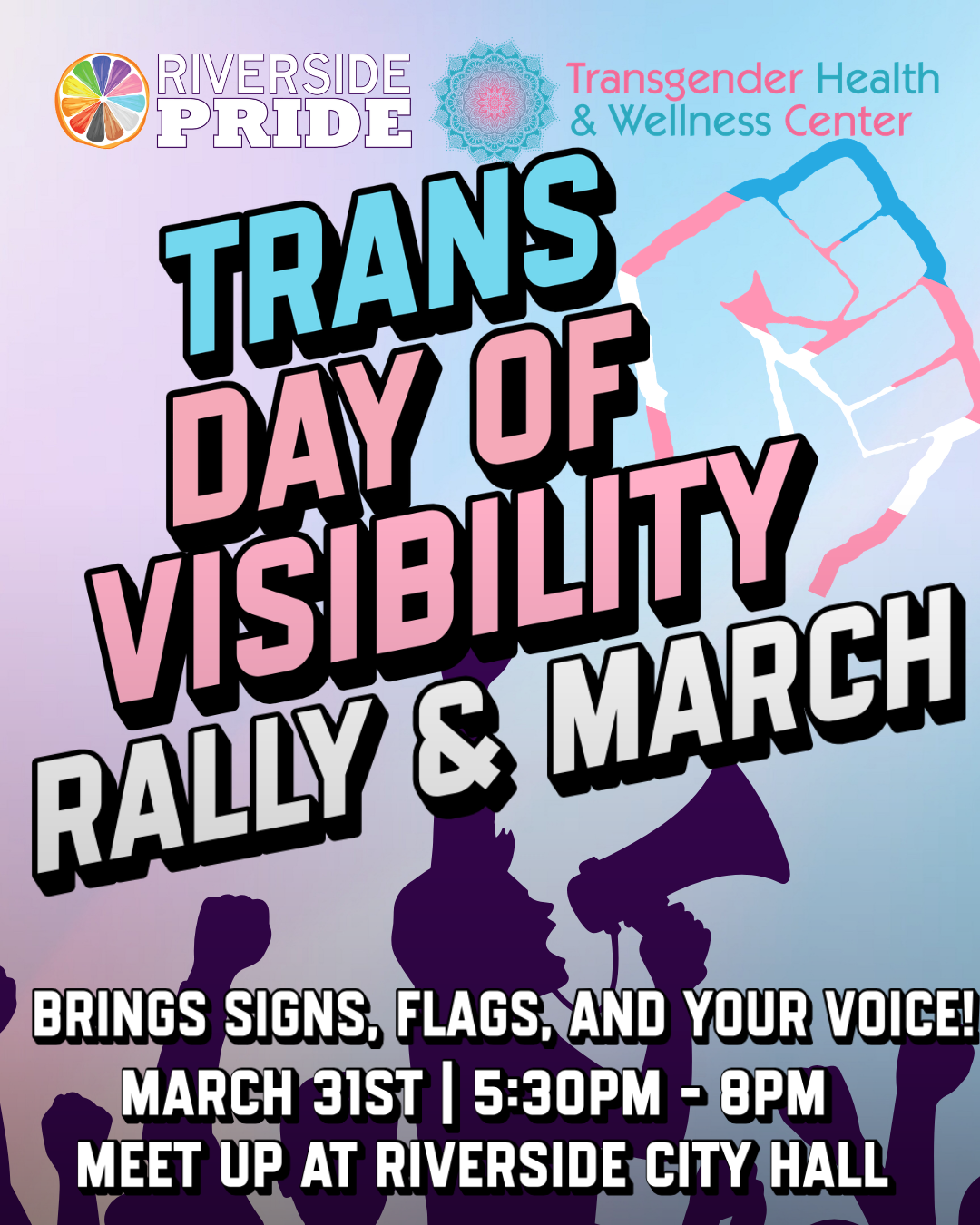 Riverside City Hall 3900 Main St, Riverside, California, United StatesJoin Riverside Pride and Transhealth and Wellness Center in celebrating Trans Day of Visibility with a powerful rally and march through the heart of Riverside! This event is a call to honor, uplift, and support the transgender and nonbinary community while advocating for equality and visibility as we see countless attacks and trans erasure from […]